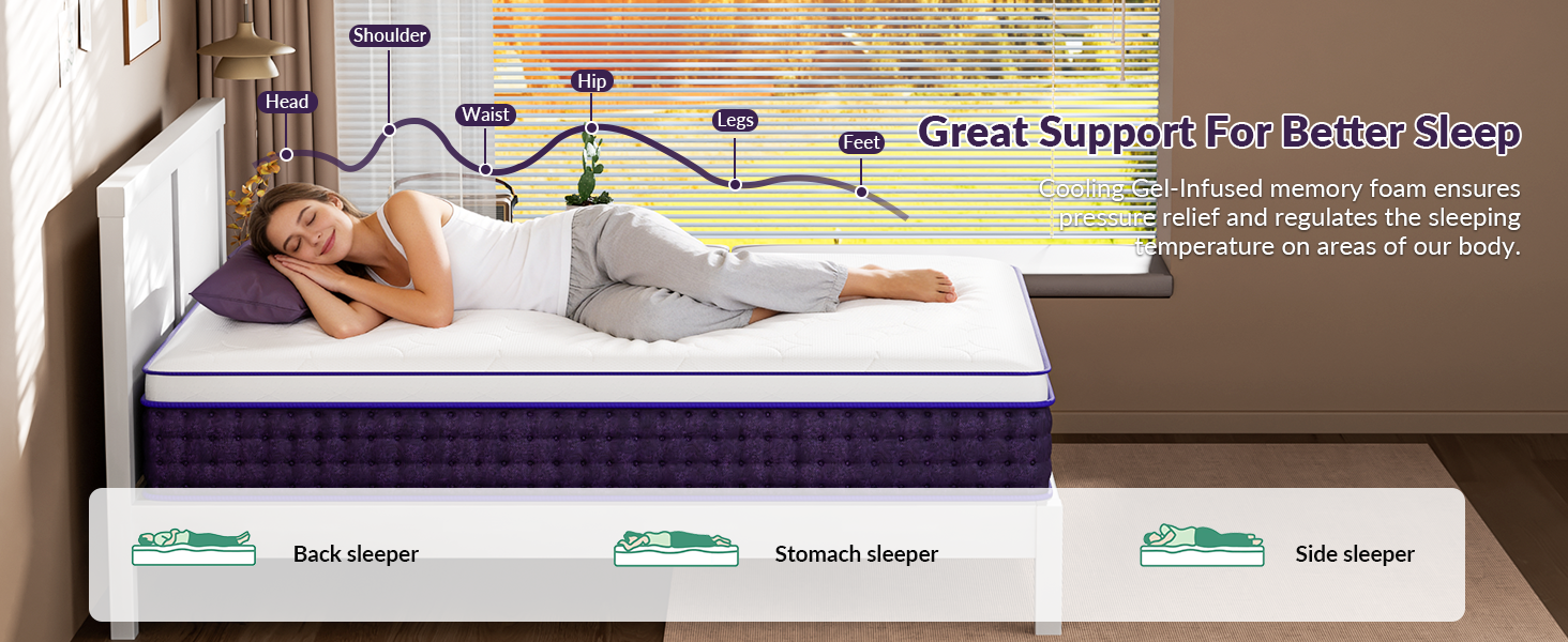 - 【Strong Support for Better Sleep】– The combination of supportive pocket springs and comfort foam layers gently cushions every part of your body, easing pressure on your back, hips, and shoulders. The cooling gel memory foam hugs your curves for a weightless feel, helping side sleepers drift off faster and wake up refreshed.